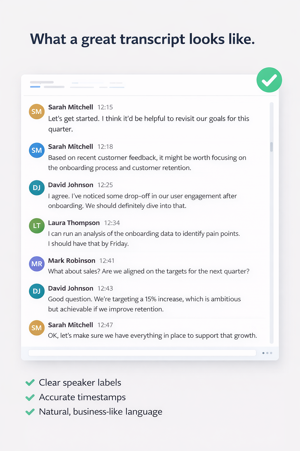 Meetings, interviews, one-to-ones, decision discussions, coaching conversations — anything where real interaction happens.